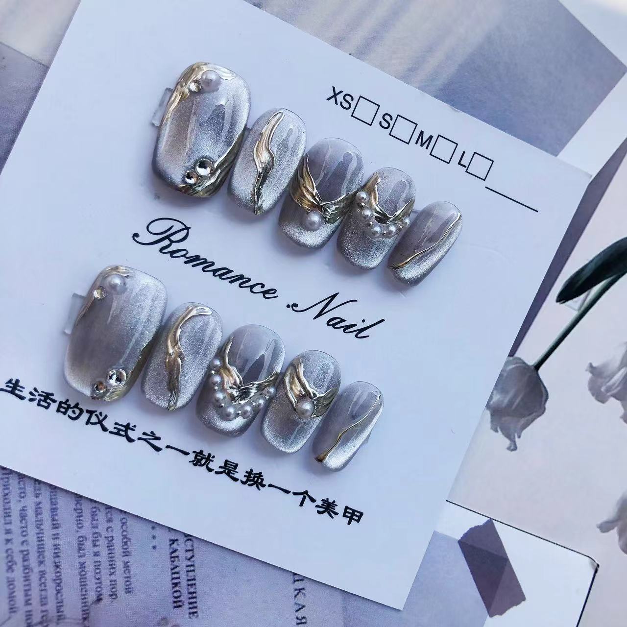黛瑞森手工美甲穿戴甲假指甲贴片高端小众黑色镂空魔镜个性异形甲