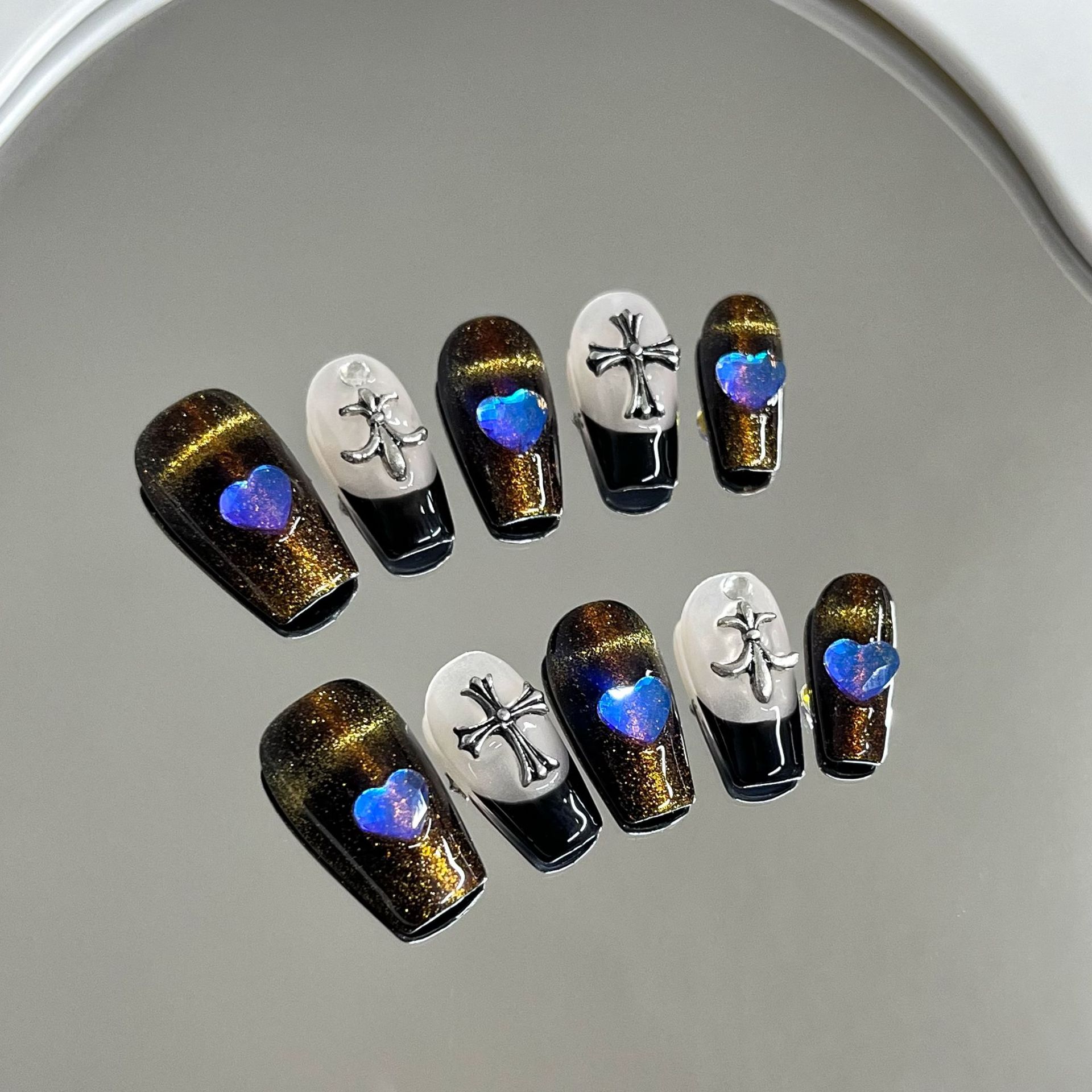 纯手工秋款穿戴甲Y2K克罗心十字架甜酷复古风 极光钻猫眼光疗甲片
