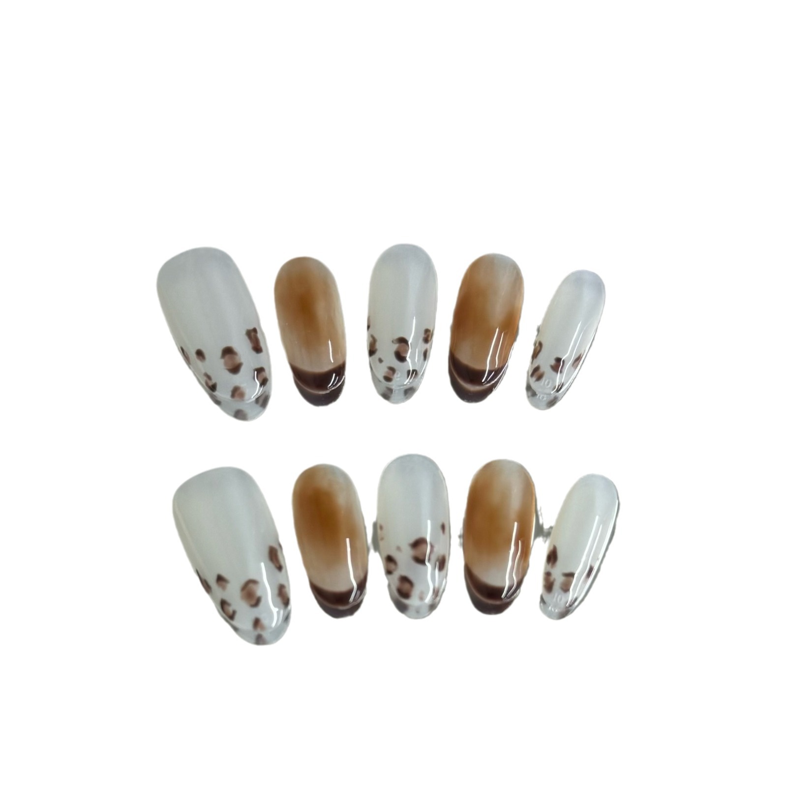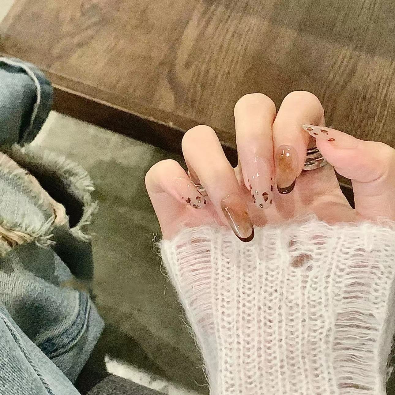 纯手工穿戴甲早秋美拉德咖啡棕晕染法式豹纹可拆卸穿戴甲工厂直发