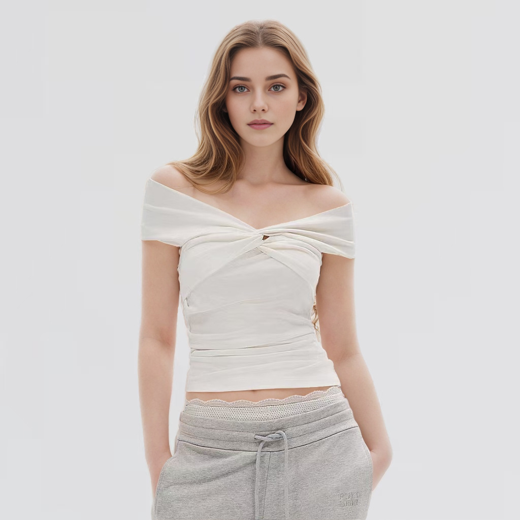 欧美跨境女装美式修身辣妹风胸前扭结设计性感一字领露肩短款上衣