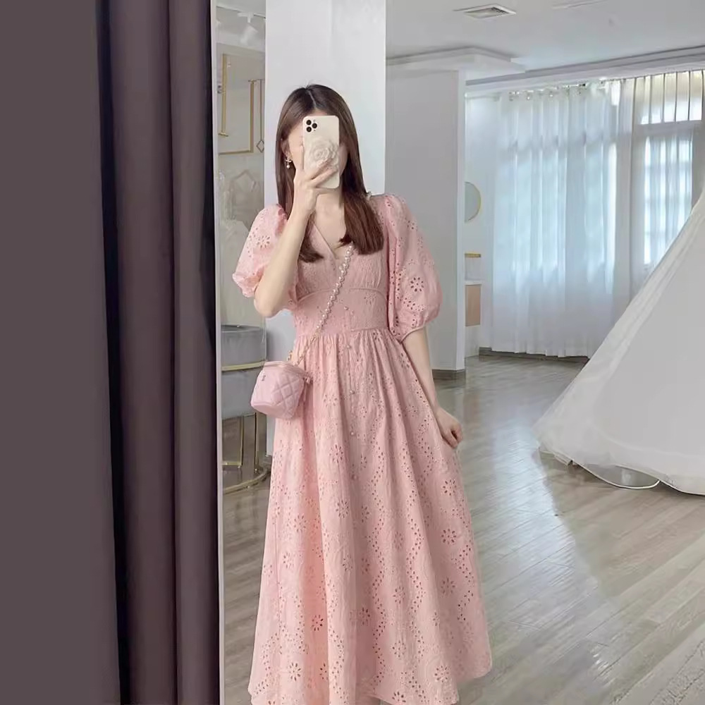 法式温柔风泡泡袖仙女长裙夏季气质显瘦镂空蕾丝粉色连衣裙女