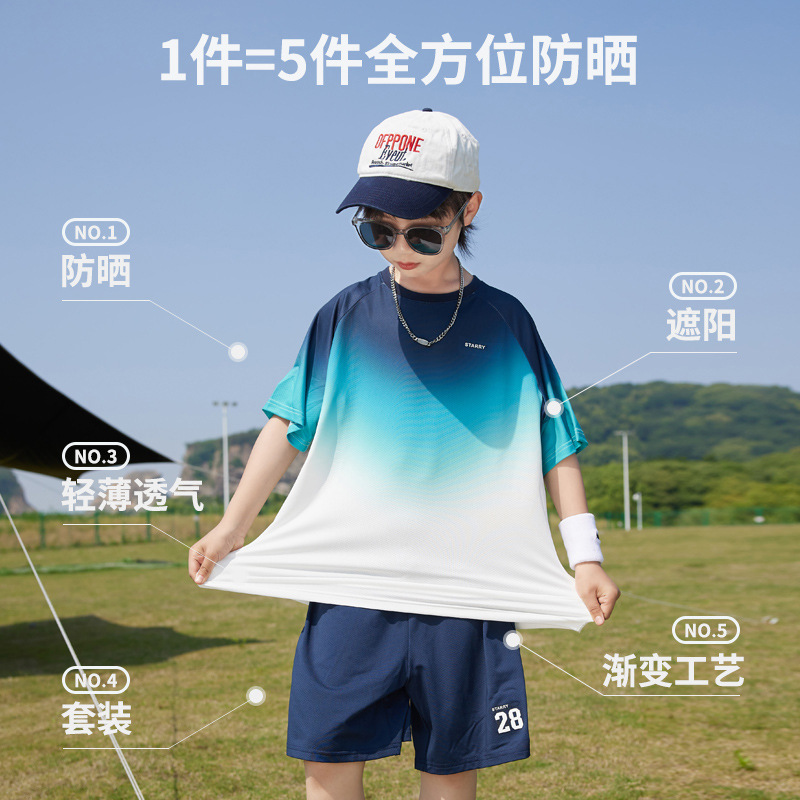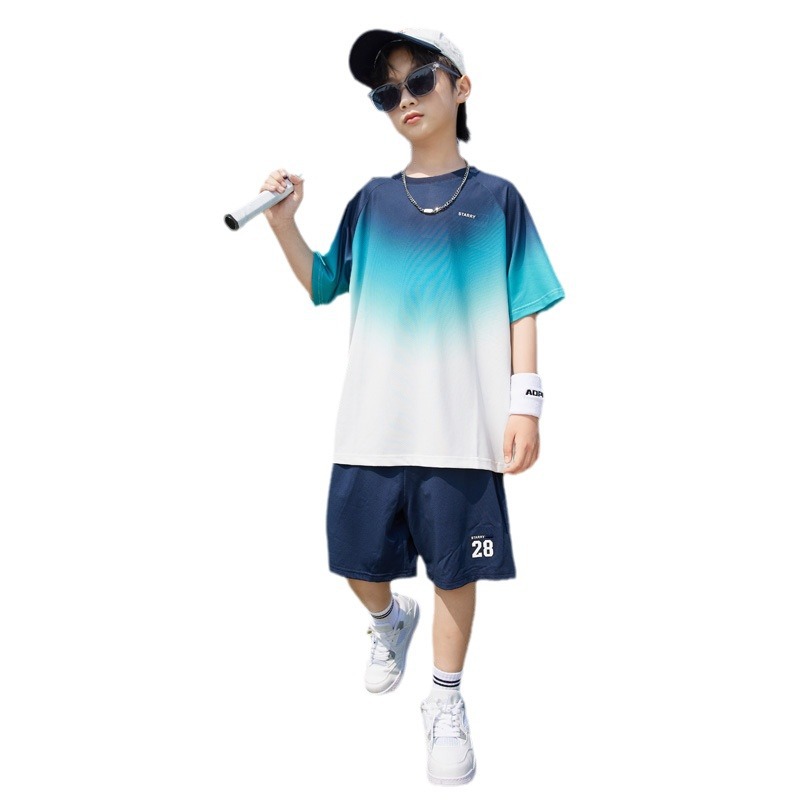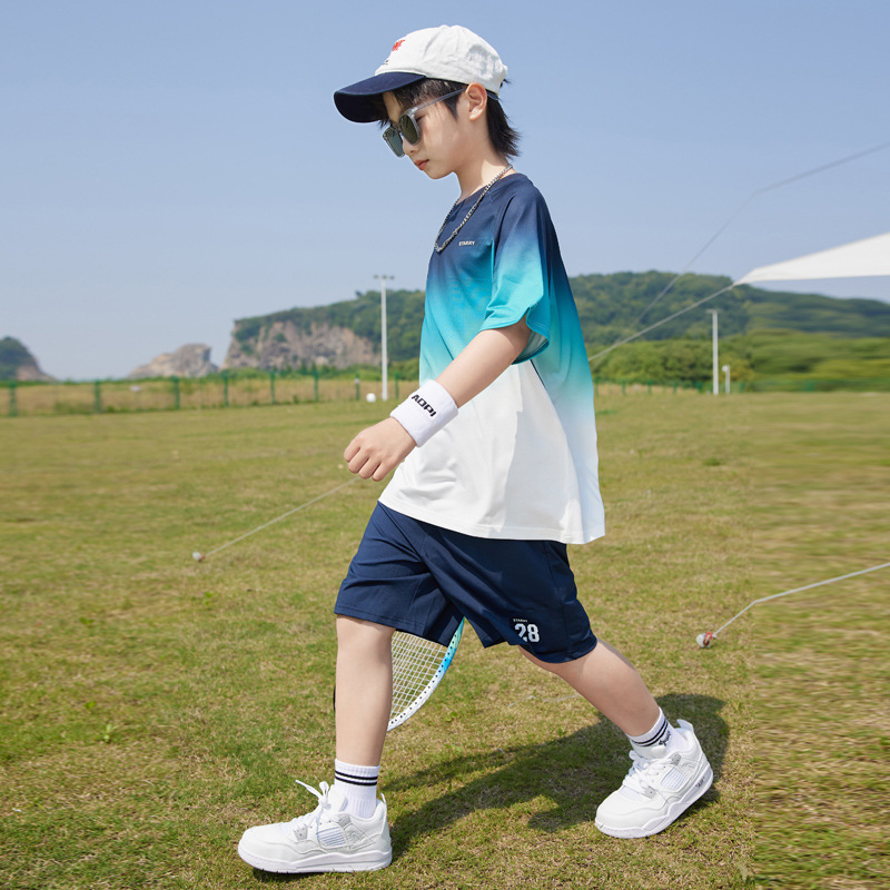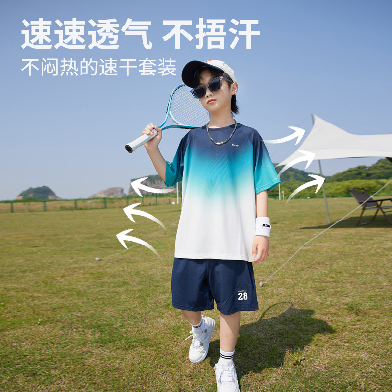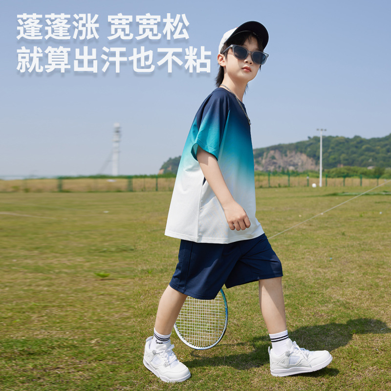 夏季中大男童速干短袖套装新童装儿童男孩短裤两件套渐变轻薄透气