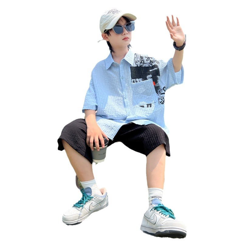 夏季中大男童短袖衬衫套装新款童装儿童男孩短裤两件套个性宽松潮