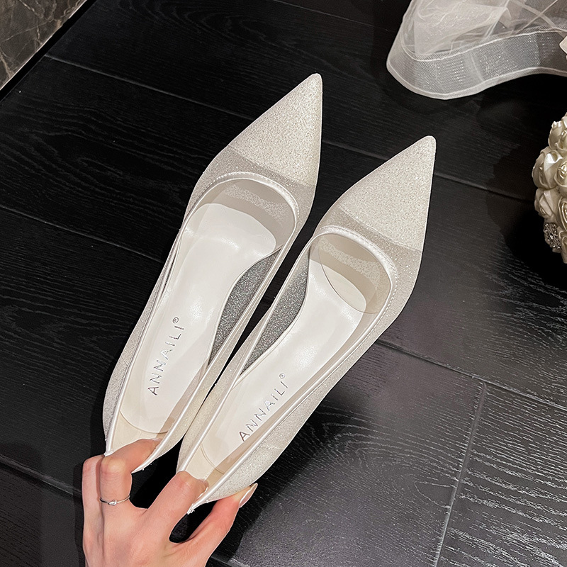 网纱尖头高跟鞋女新款性感蕾丝白色婚鞋宴会礼服香槟色伴娘鞋