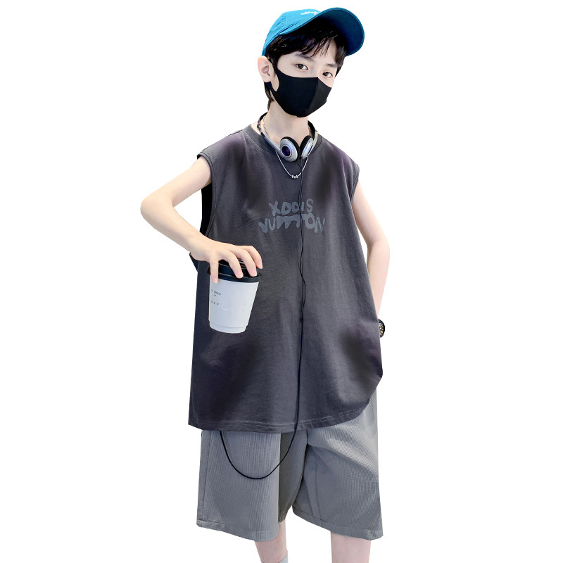 夏季新款大男童字母背心童装儿童男孩纯色无袖背心个性潮酷百搭