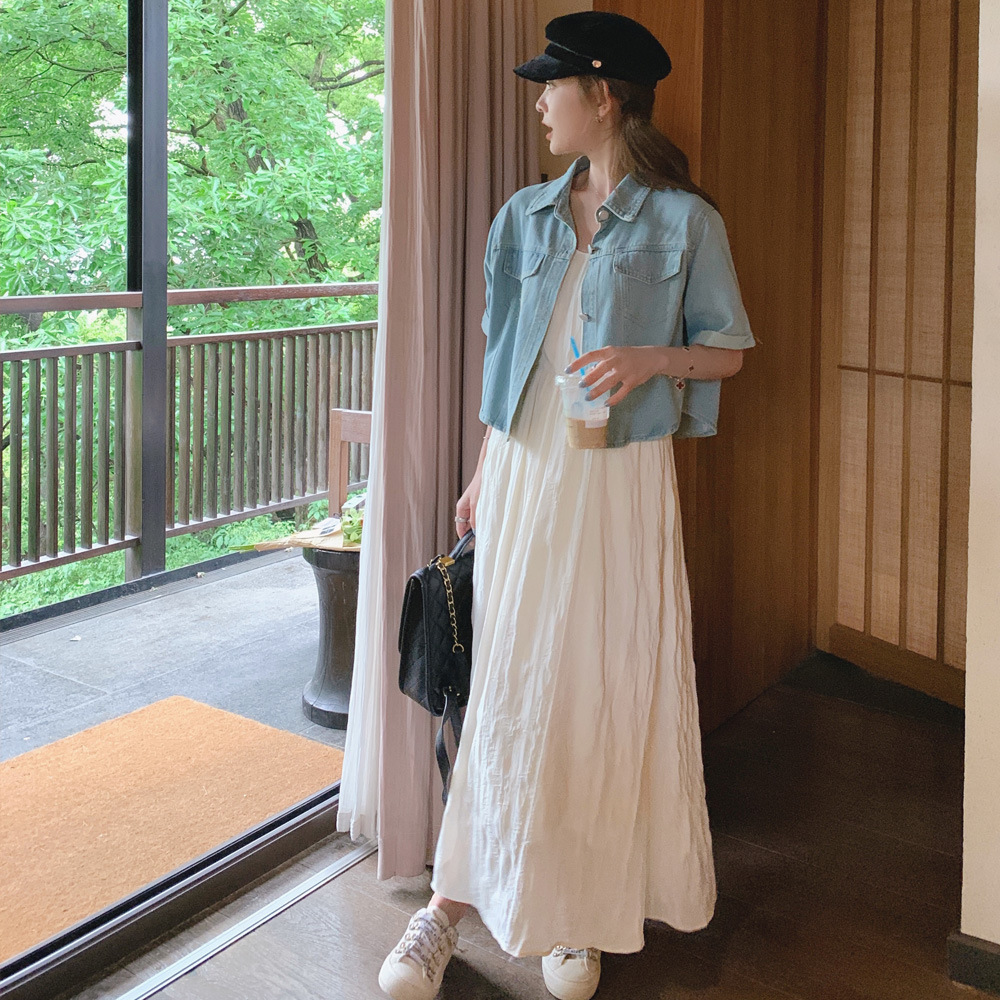 复古牛仔外套白色吊带连衣裙两件套女夏季今年流行漂亮套装裙