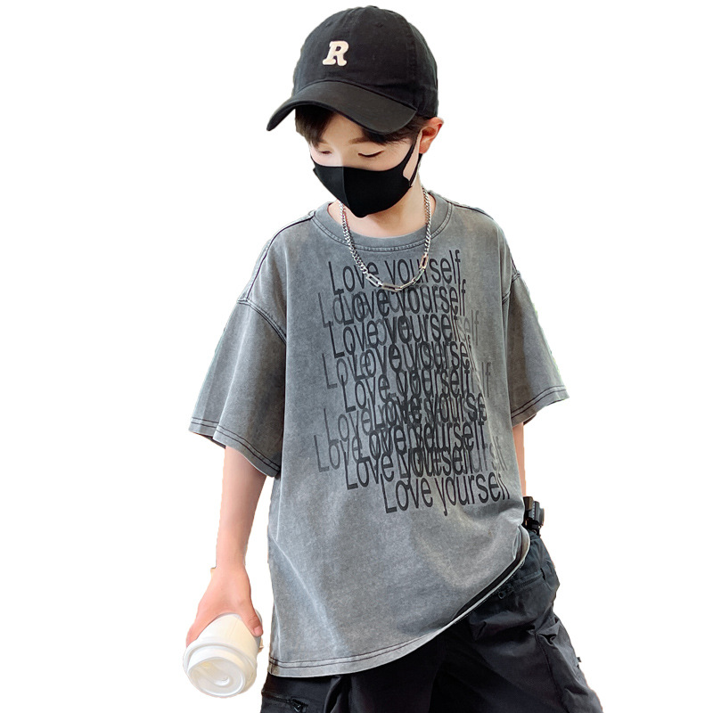 夏季中大男童短袖T恤新款童装儿童男孩字母做旧t个性潮酷上衣