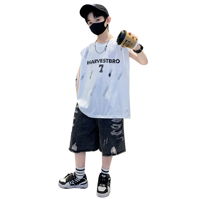夏季新款大男童字母背心童装儿童男孩纯色无袖背心个性潮酷百搭