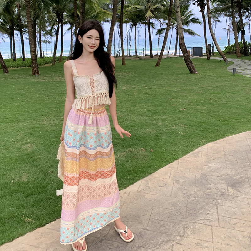 波西米亚风复古流苏吊带上衣高腰半身裙女新款夏日多巴胺套装