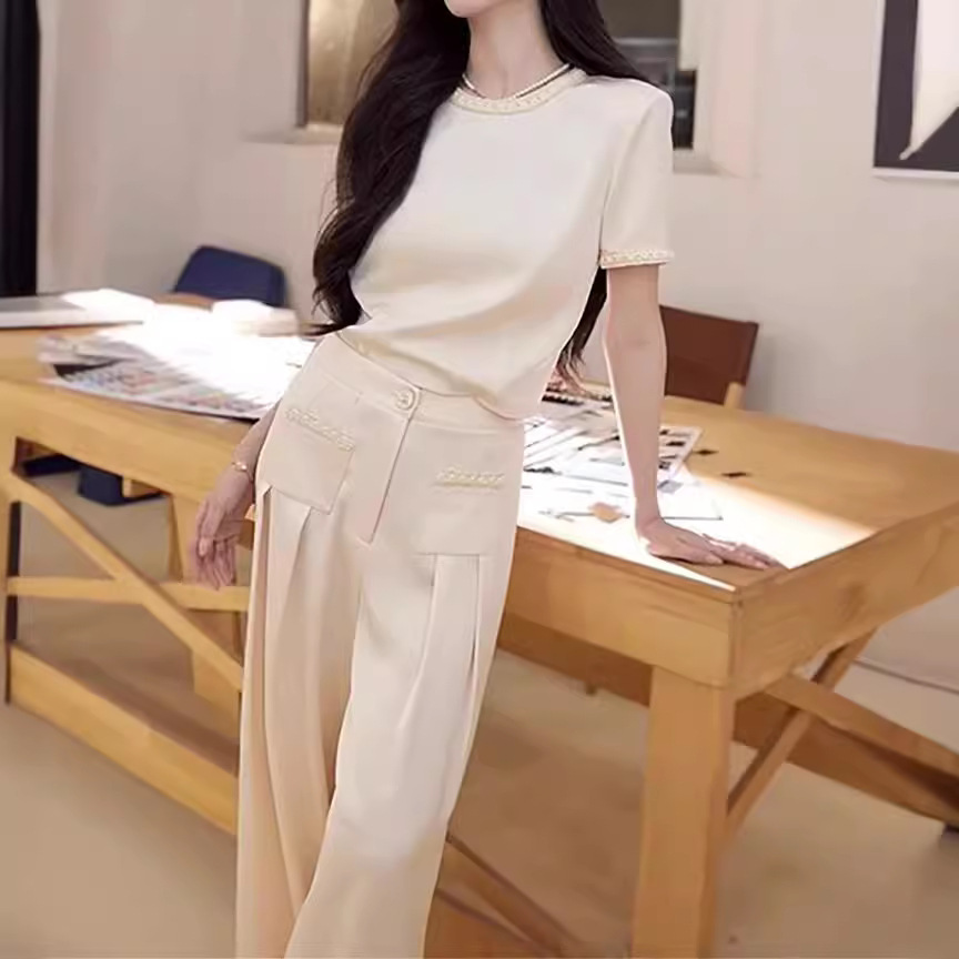 小香风时尚套装女夏季新款干练气质名媛短袖上衣阔腿裤两件套