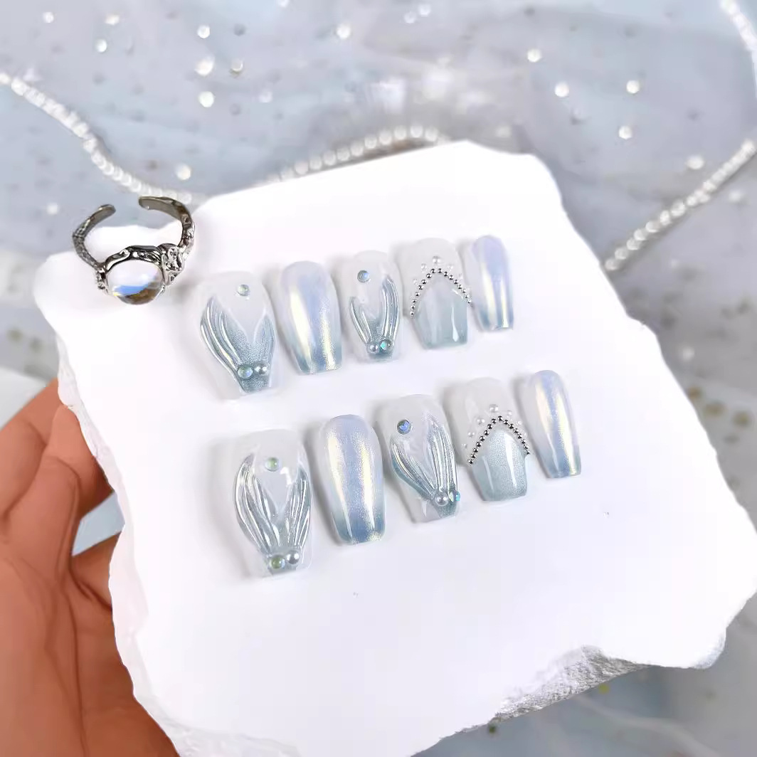新款纯手工穿戴甲人鱼尾手绘轻奢精品短款美甲贴片成品可拆卸