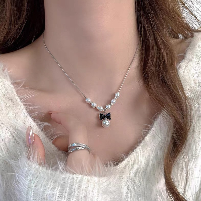 韩国甜酷风串珠蝴蝶结珍珠项链配饰品女轻奢小众高级感气质毛衣链