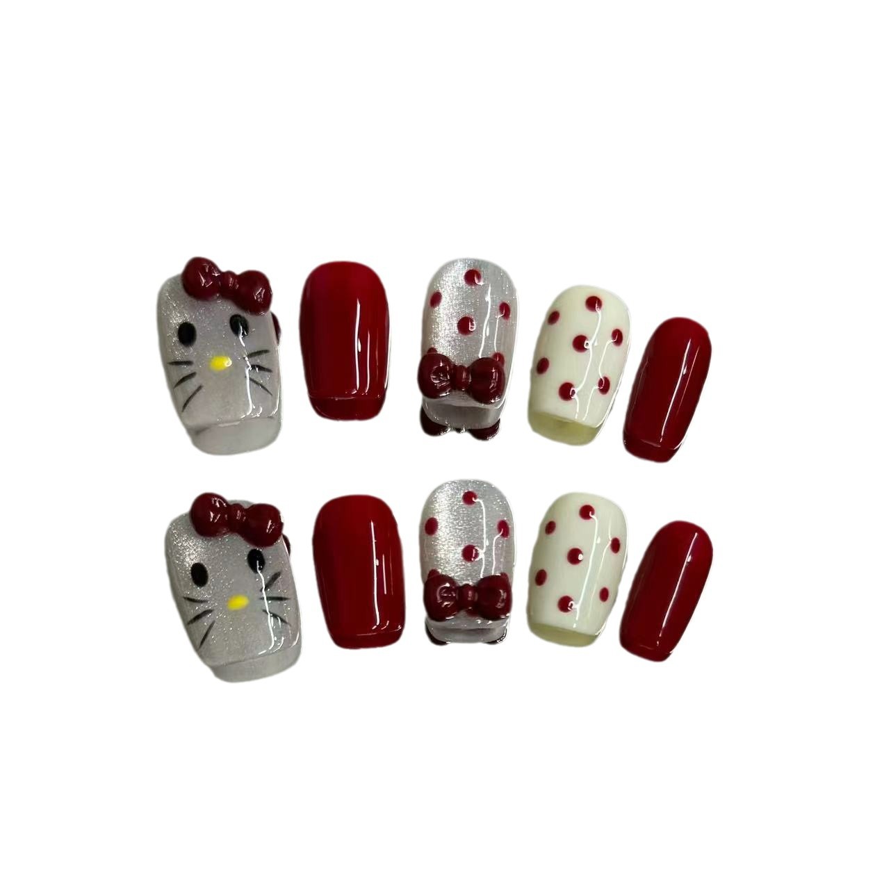 纯手工穿戴甲可爱波点红色Kitty卡通猫眼简约手绘美甲贴片成品