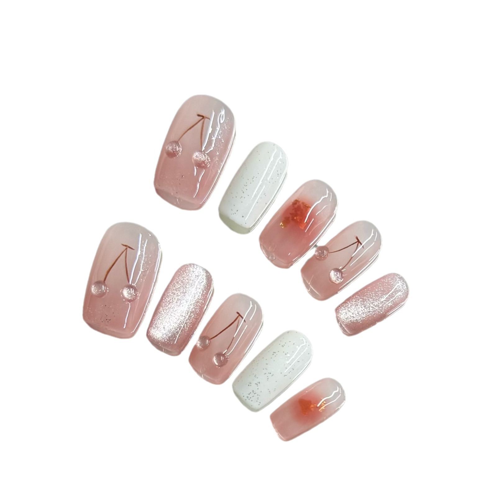 手工穿戴甲ins温柔粉红猫眼樱桃晕染甜美可爱日常显白可拆卸美甲