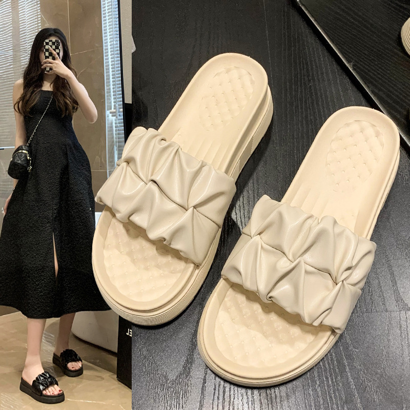凉拖女夏季新款松糕厚底纯色褶皱圆头百搭外穿沙滩休闲女拖鞋