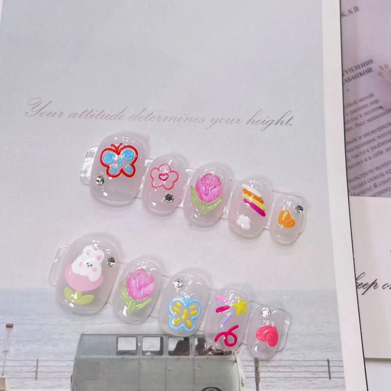 纯手工穿戴花丛里的兔子可爱手绘学生甲片显白美甲片可拆卸穿戴甲