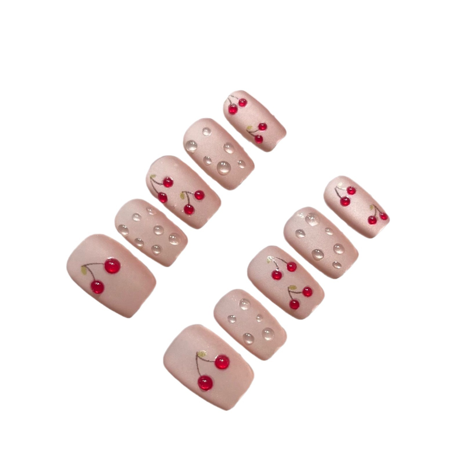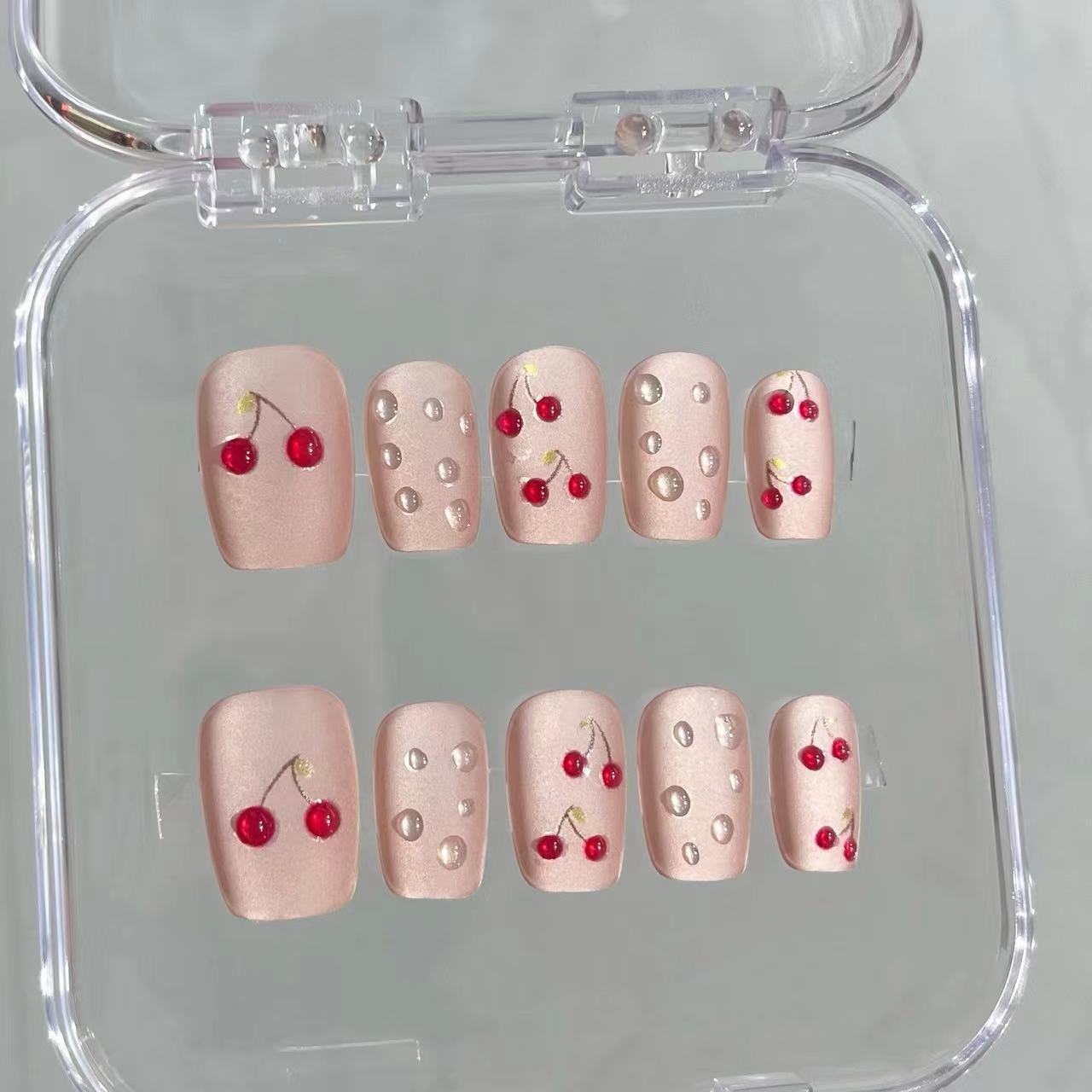 晨露樱桃|半手工穿戴甲水滴樱桃猫眼春夏小清新简约可拆卸穿戴甲