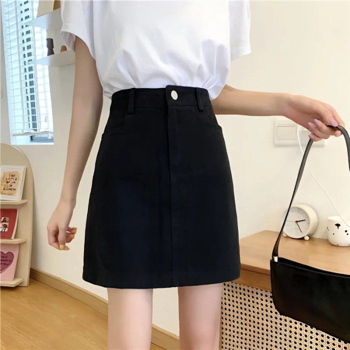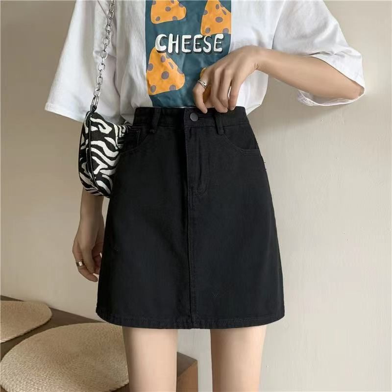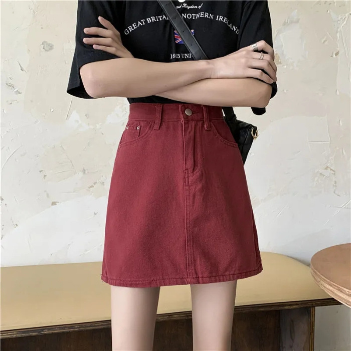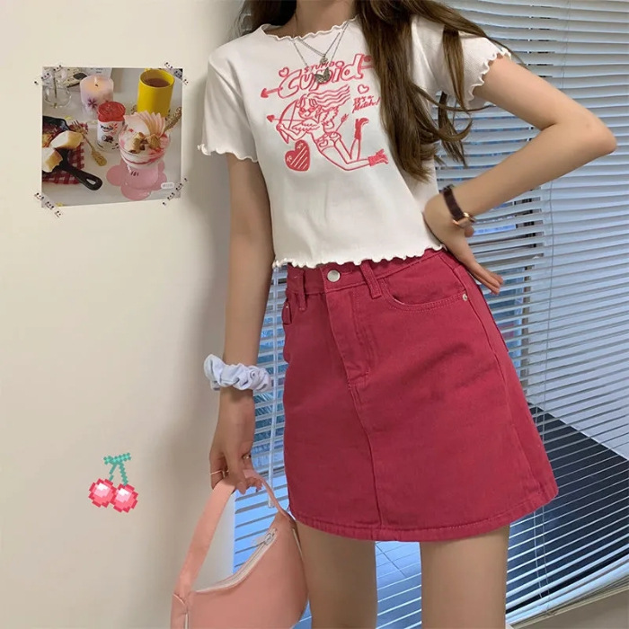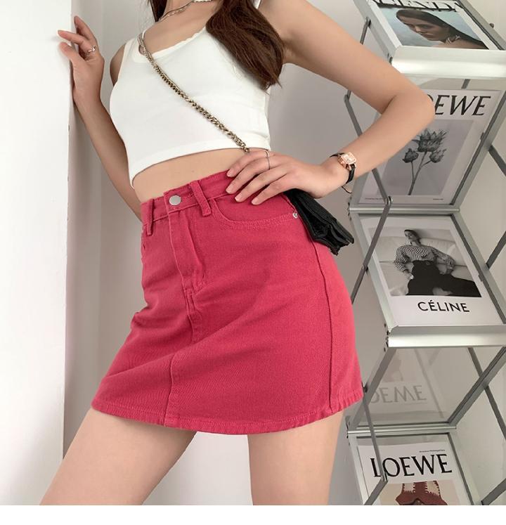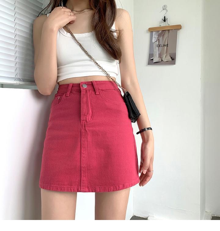 日系减龄女团夏玫红色短裙女牛仔半身裙百搭甜辣风包臀裙显瘦ins