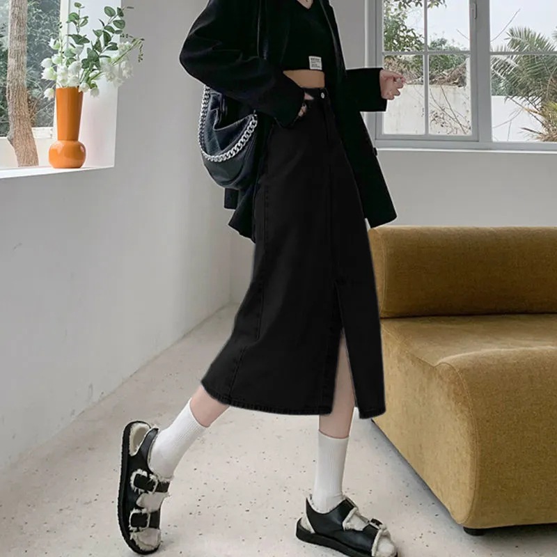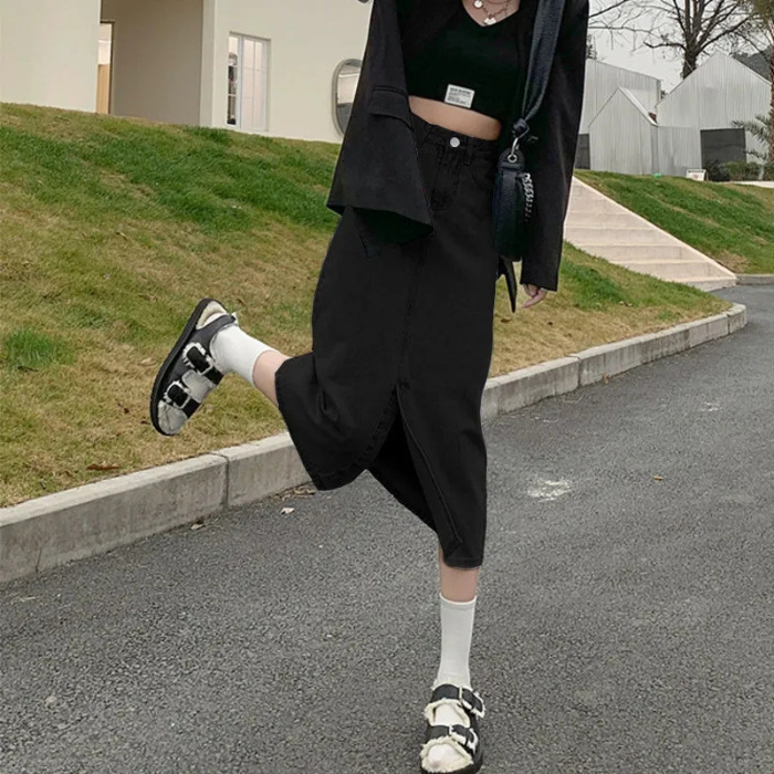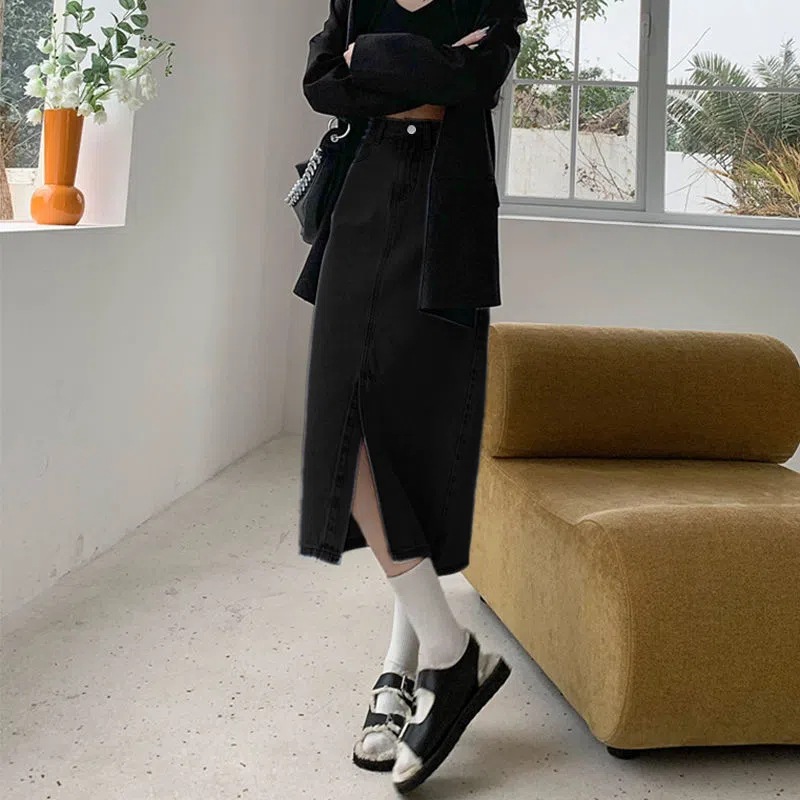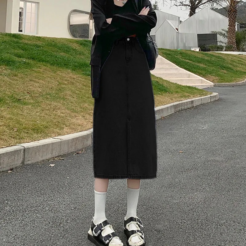 a字开叉黑色牛仔半身裙中长款高腰显瘦百搭宽松学生梨形大码长裙