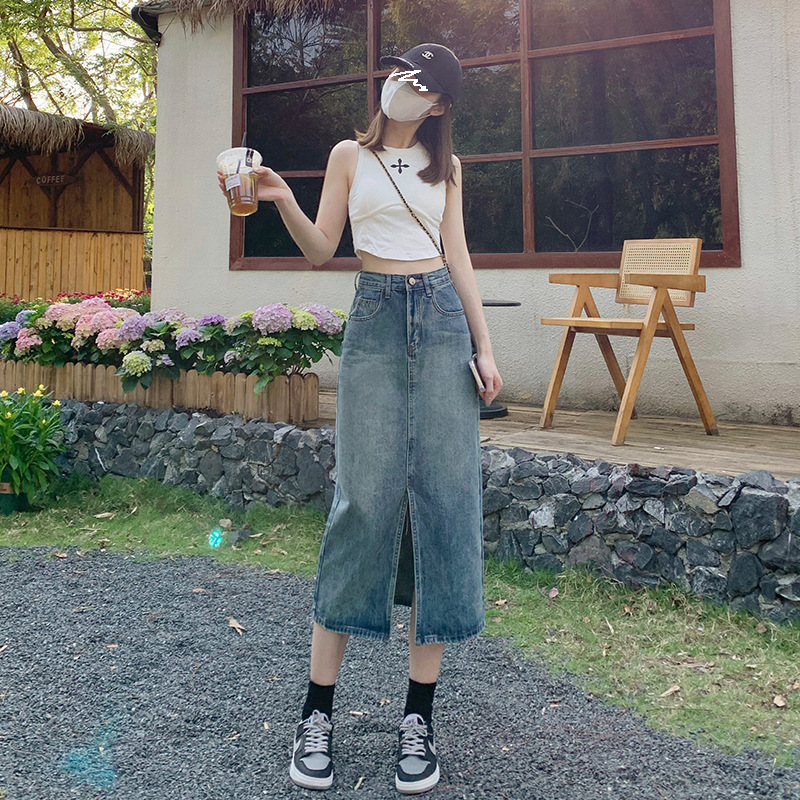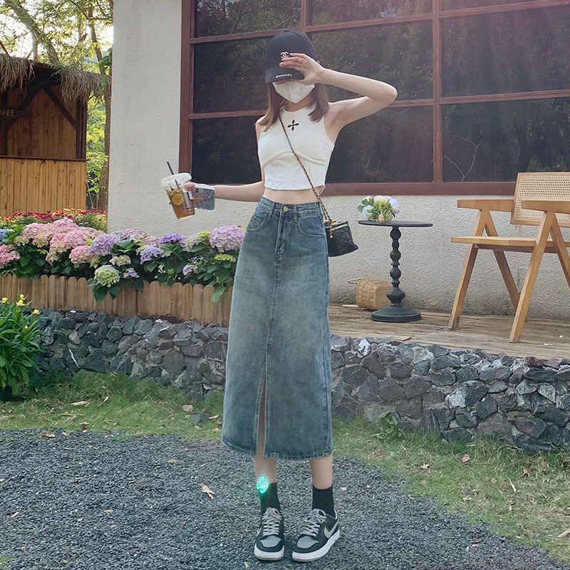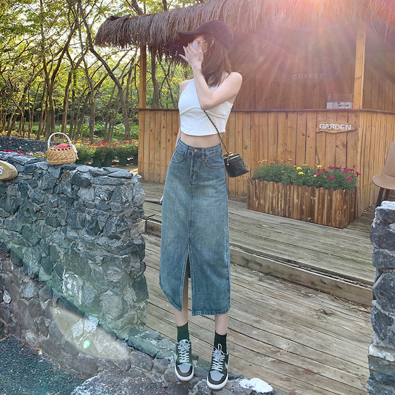 百搭复古开叉牛仔裙慵懒休闲感中长款高腰显瘦直筒半身裙女小个子