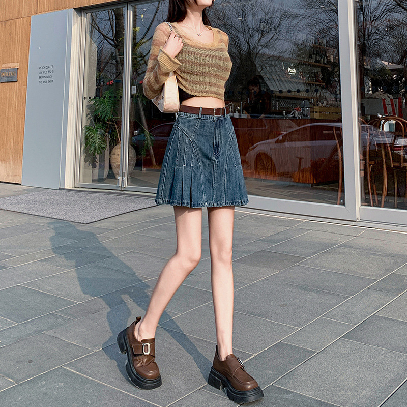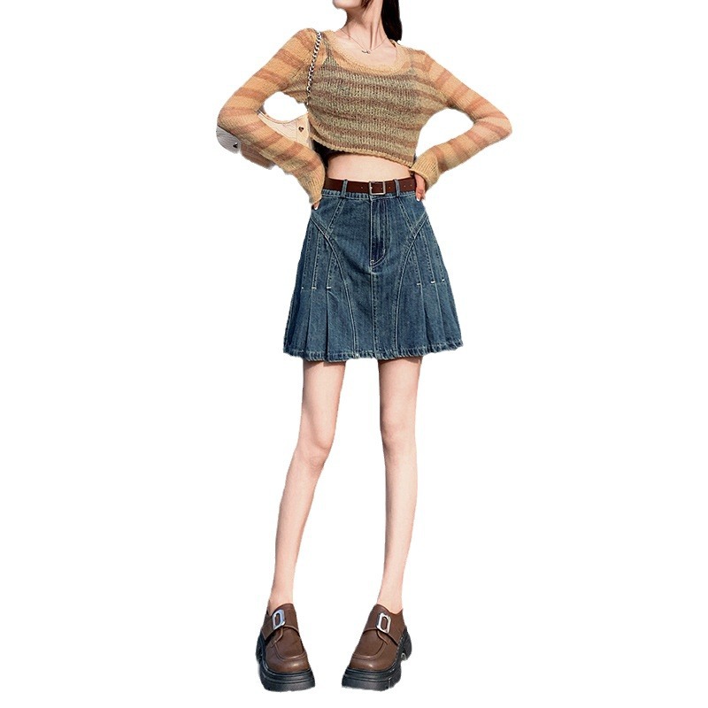 复古蓝百褶裙牛仔半身裙女春夏新款高腰显瘦a字裙包臀百褶裙