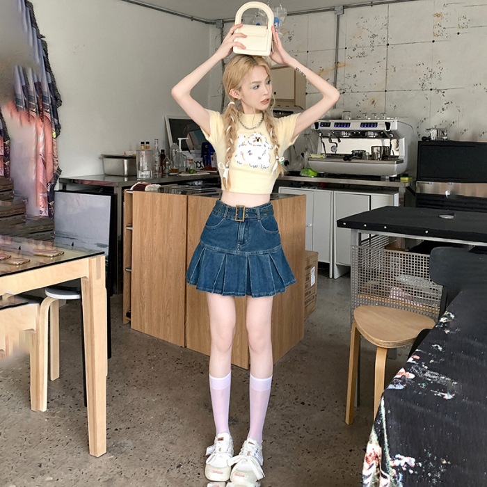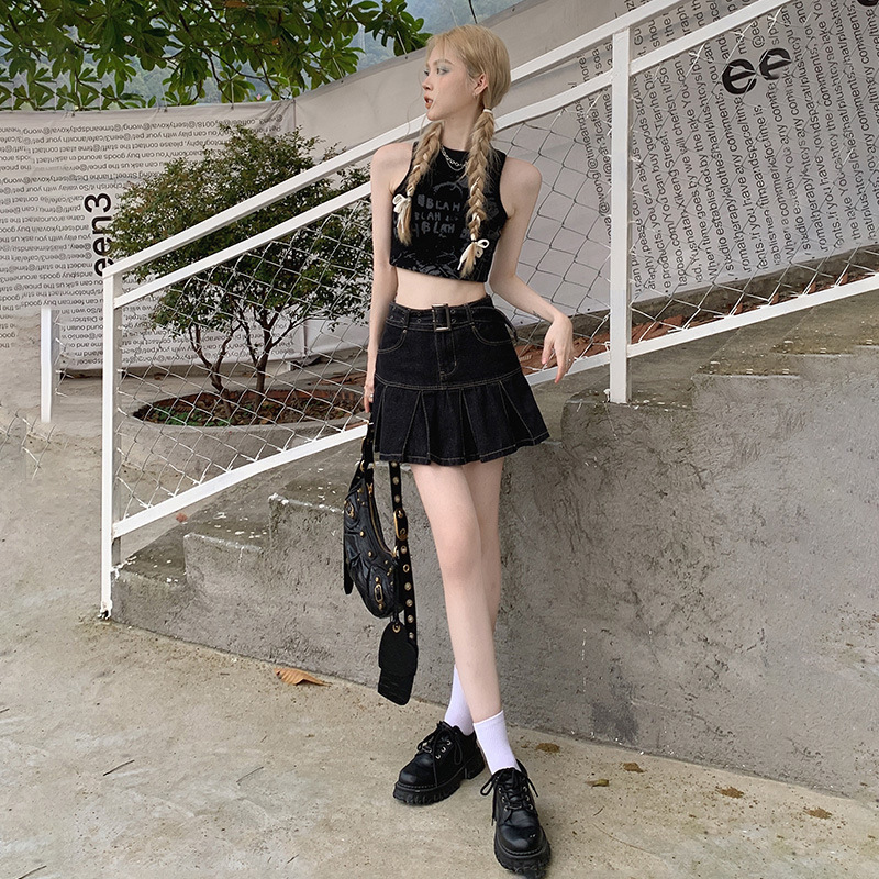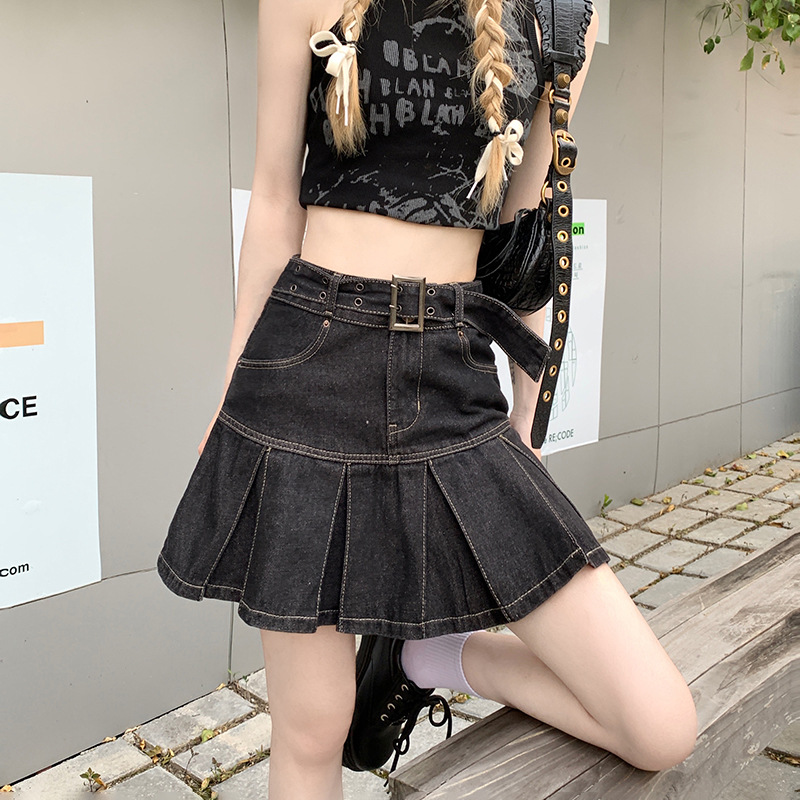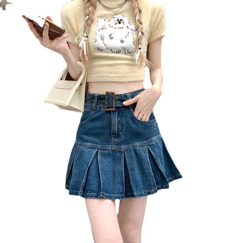 牛仔半身裙女夏新款高腰显瘦a字美式辣妹小众穿搭百褶裙ins潮