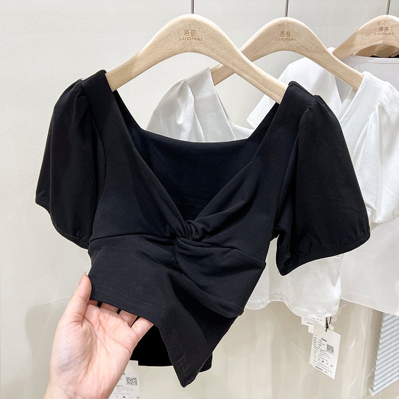 黑色v领t恤女短袖ins潮锁骨别致泡泡袖设计感辣妹短款上衣女