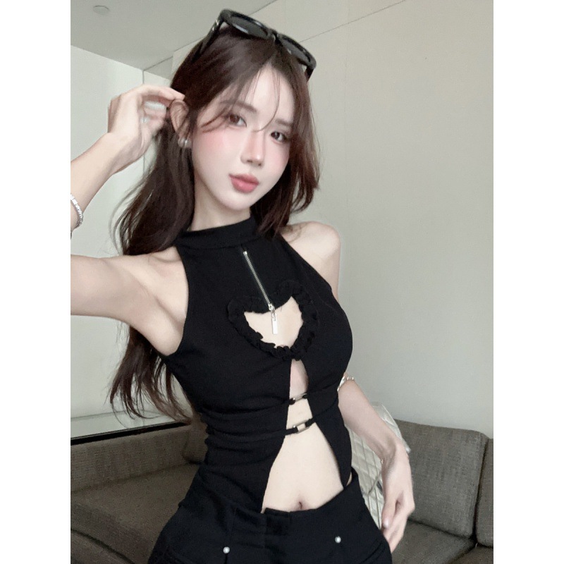 美式辣妹设计感爱心镂空拉链开叉修身显瘦百搭短款背心