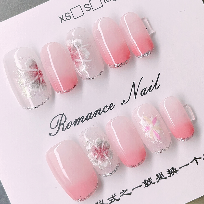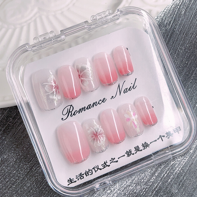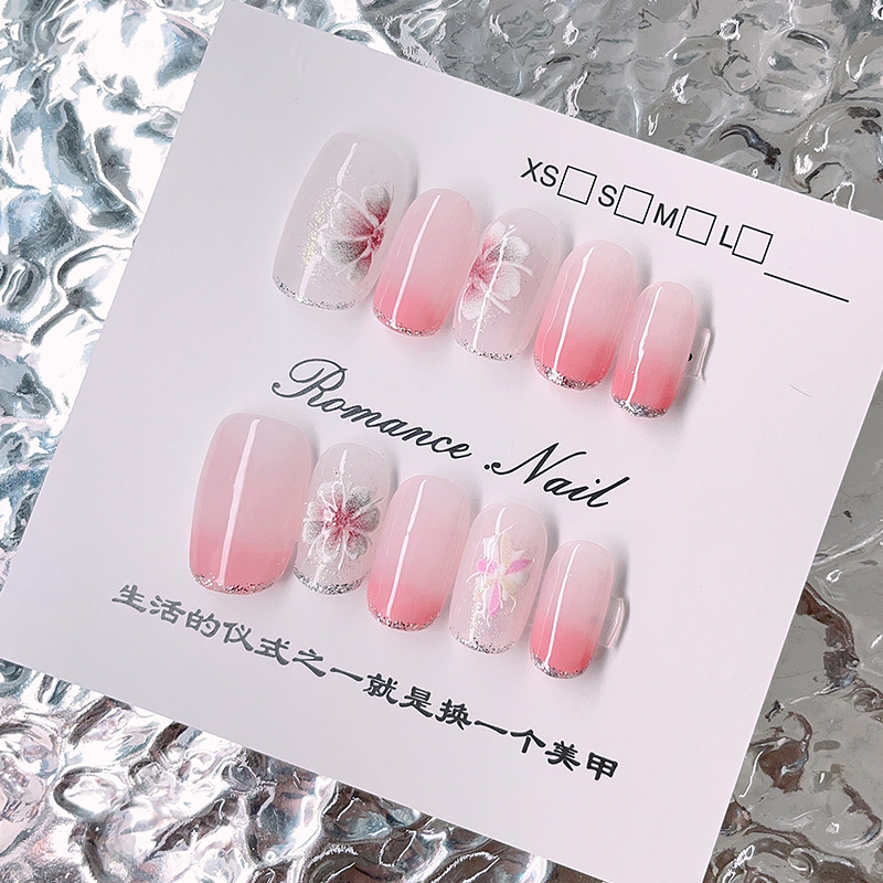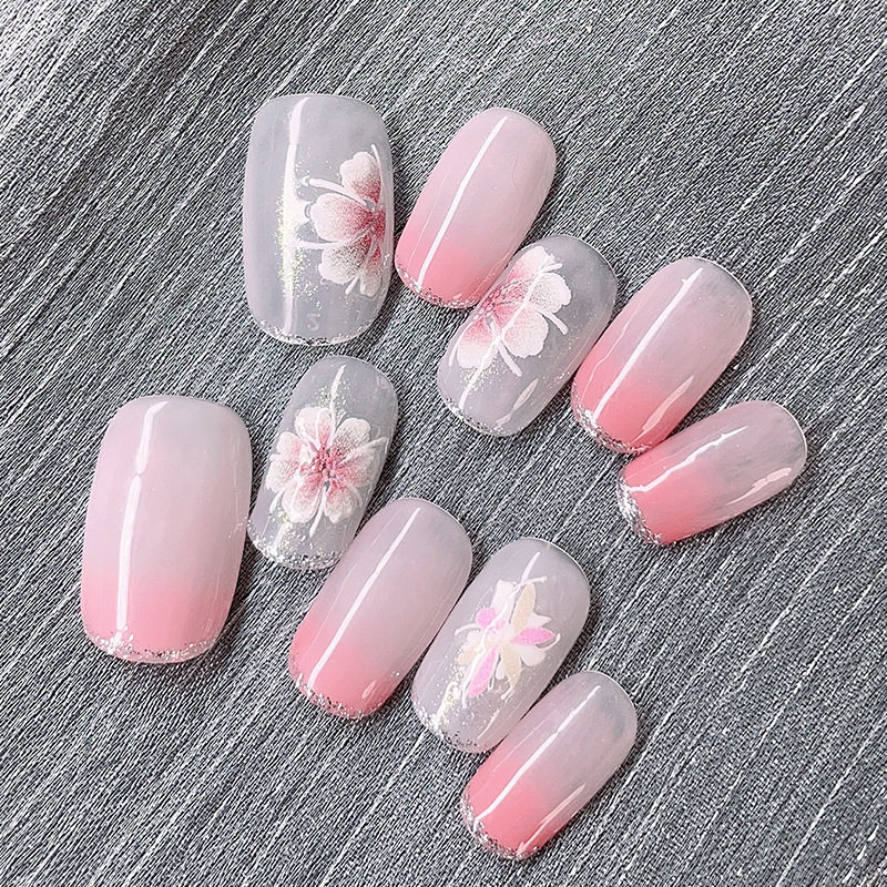 纯手工穿戴甲墨镜粉色手绘花朵高级感光疗甲片可拆卸重复使用美甲