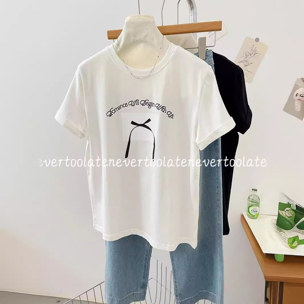 夏季十三行韩系小清新蝴蝶结印花百搭上衣新款正肩莫代尔短袖T恤