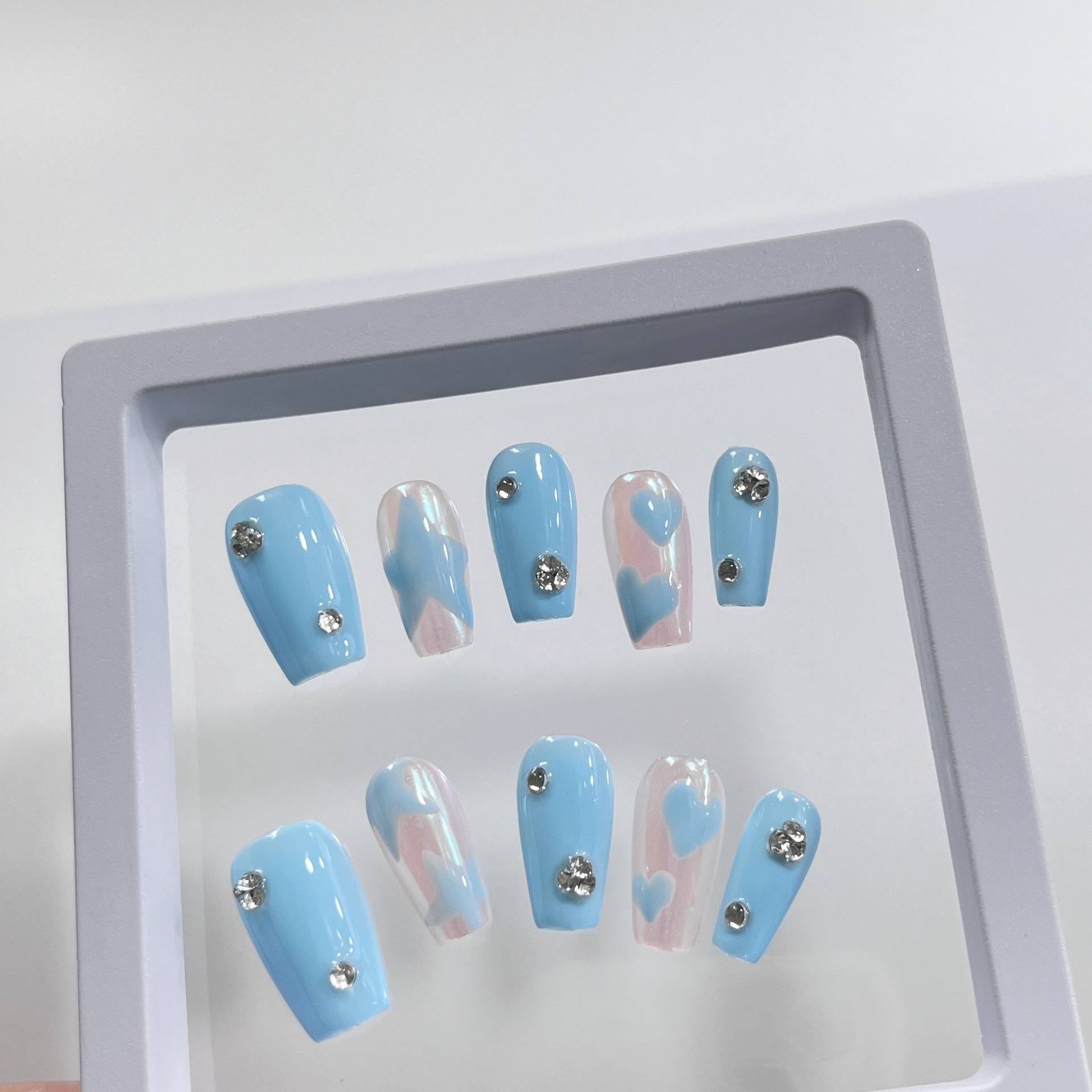 纯手工穿戴甲清新奶蓝baby蓝手绘爱心光疗甲可拆卸重复使用美甲