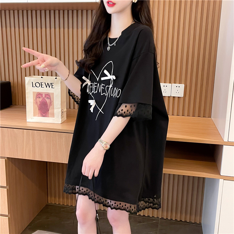 纯棉网纱拼接中长款短袖t恤女2025新款爆款宽松瘦设计感欧货上衣
