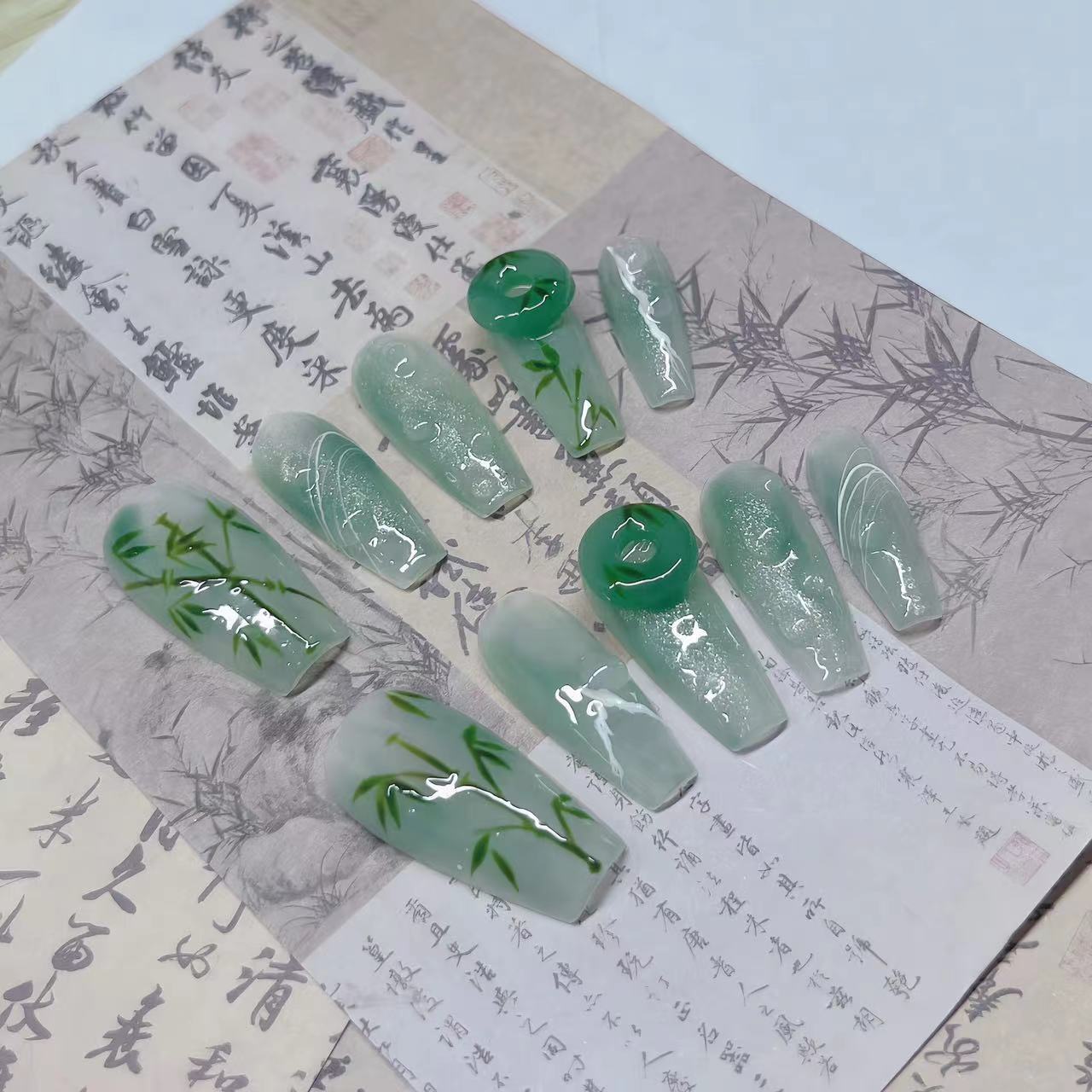 纯手工穿戴甲翡翠竹林新中式仙女风光疗甲片春夏新款显白晕染美甲