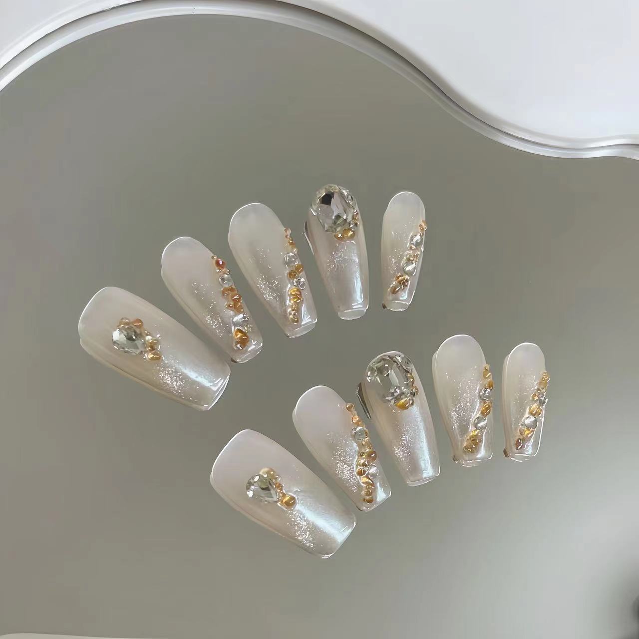 纯手工猫眼穿戴甲贴钻白月光清冷感光疗甲片可拆卸重复使用穿戴甲