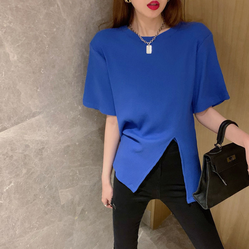 T恤女新款设计感小众宽松不规则开叉圆领显瘦短袖上衣内搭