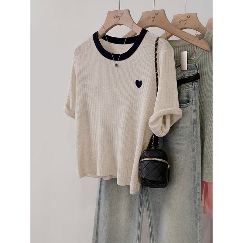 正肩冰丝针织衫短袖t恤女夏季薄款新款设计感小众宽松上衣ins