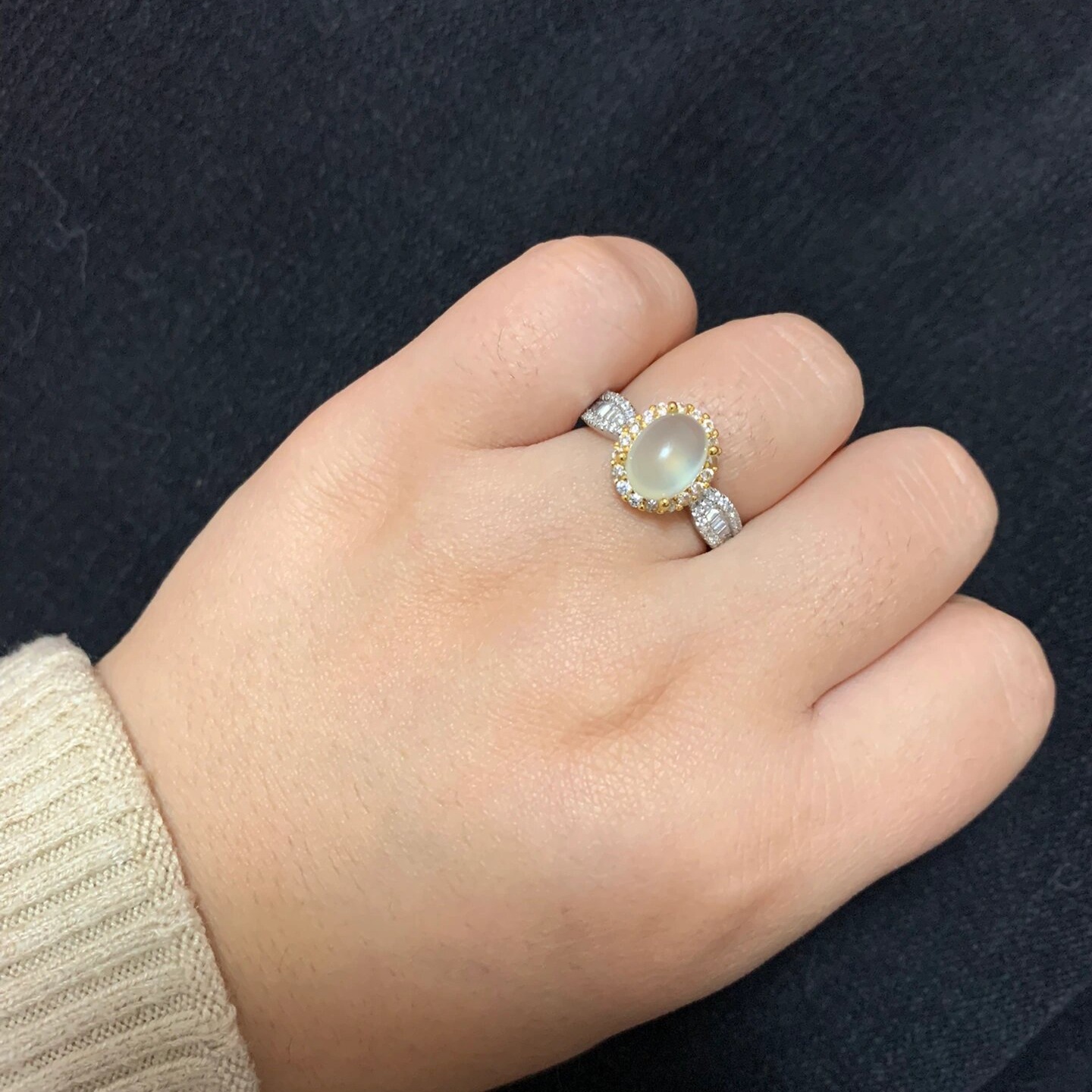 S925纯银橄榄绿石圆盘戒指女锆石镶嵌拉丝质感开口女款戒指可调节