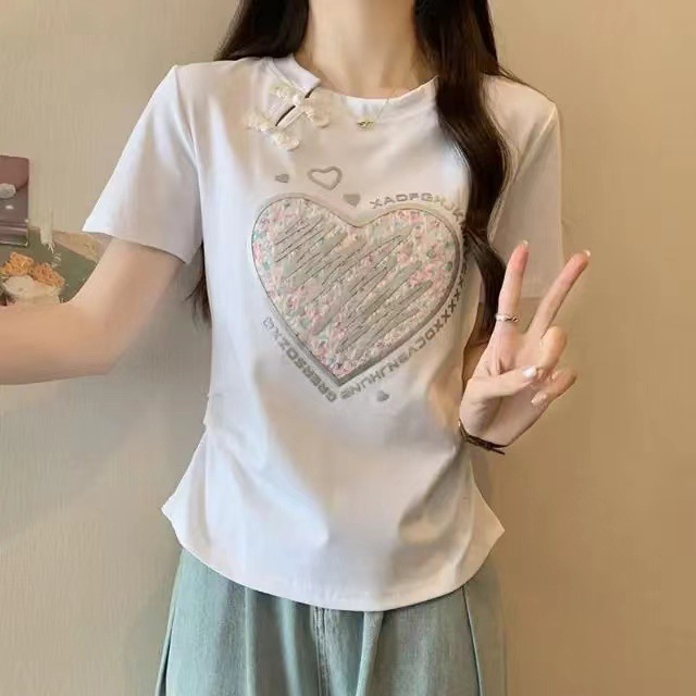 2025夏季女新中式盘扣螺纹棉短袖女t恤重工设计感洋气显瘦百搭