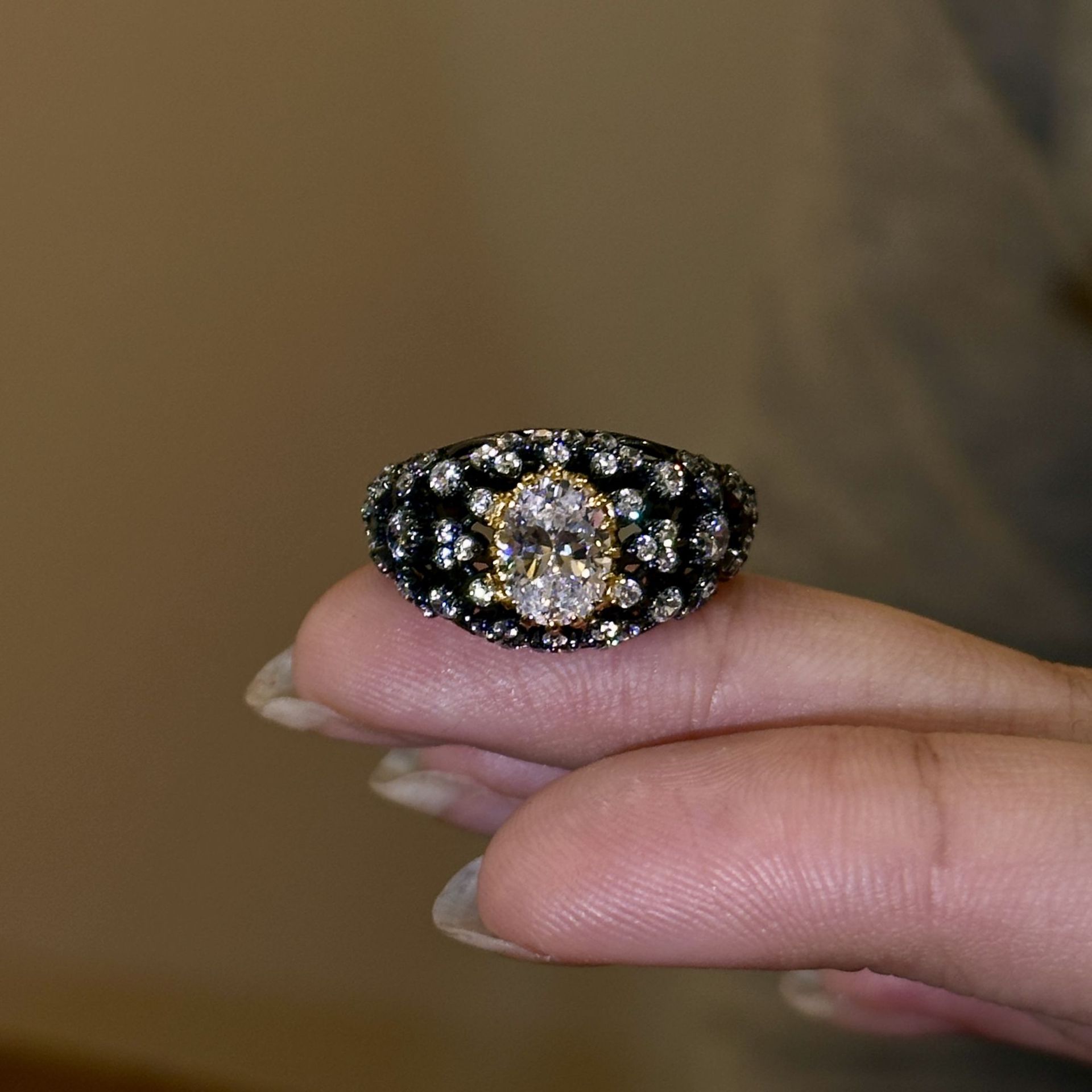 S925纯银镀黑金轻奢复古满天星闪钻鸽子蛋戒指中古风重工时髦钻戒