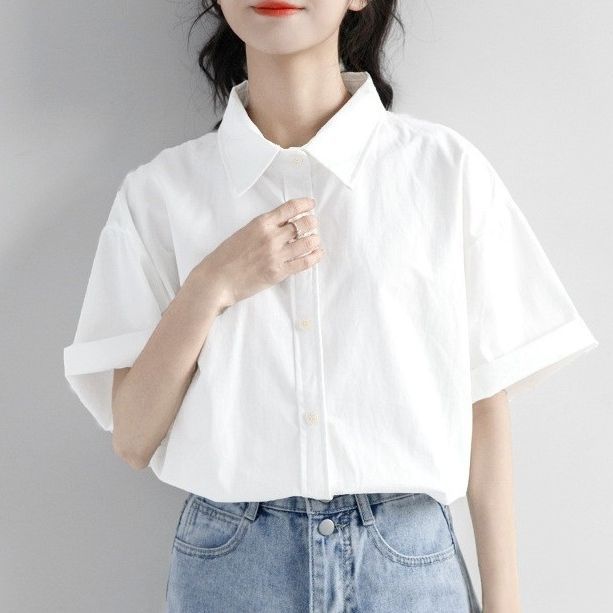 纯白基础款方领夏季白色工装短袖衬衫女夏宽松韩版上衣百搭衬衫