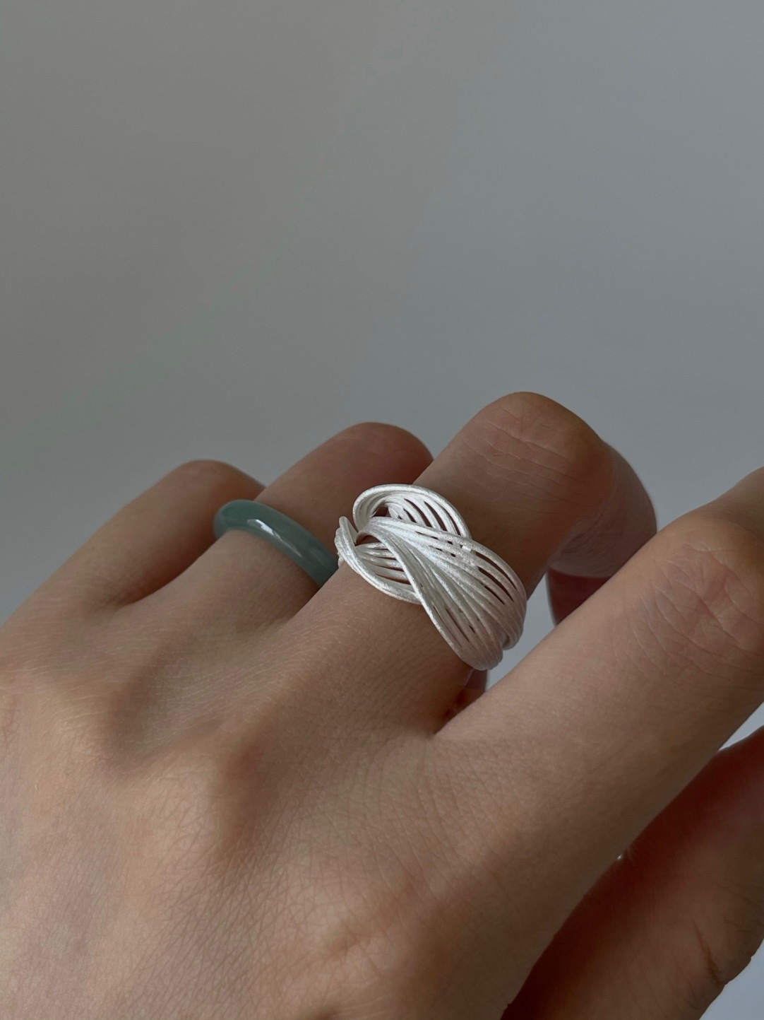 S925纯银优雅烧白立体线条编织戒指ins叠戴小众极简几何开口指环