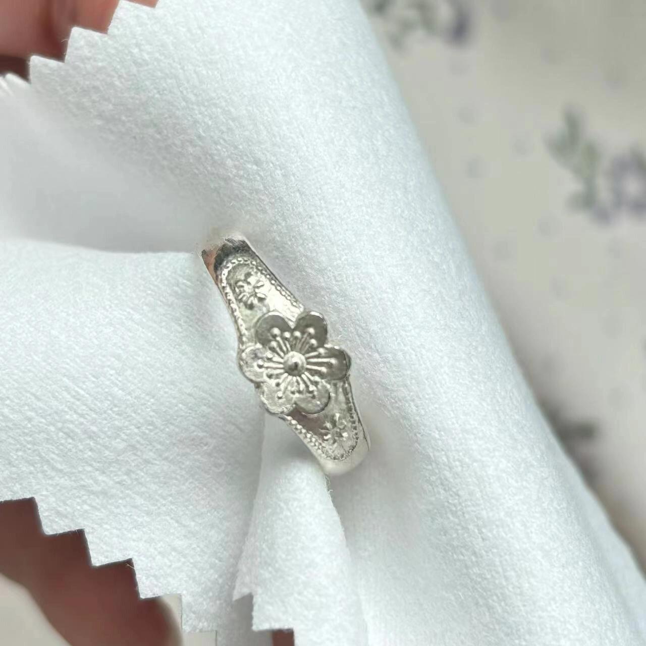 中式复古花纹戒指女S925纯银小众设计感老式梅花缠绕花戒开口指环