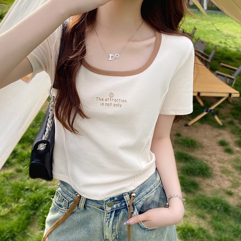 正肩方领短袖T恤女夏季纯欲辣妹修身显瘦锁骨短款鱼骨纯棉上衣ins