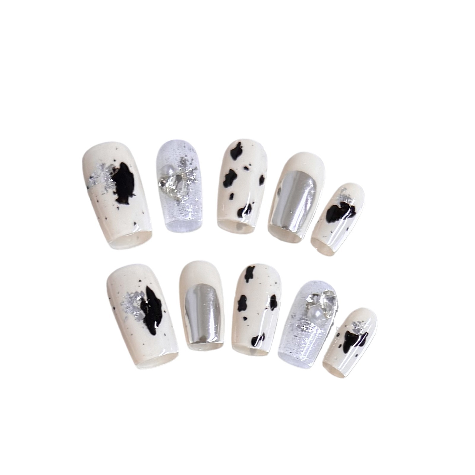 手工穿戴甲黑白魔镜粉跳色涂鸦镶钻高级感可拆卸美甲可爱显白短甲