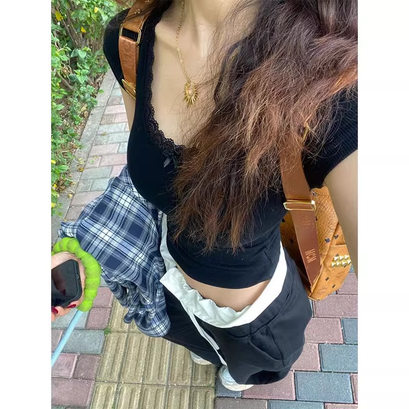 黑色纯欲别致短款蕾丝花边大领口短袖夏季女甜辣美式纯欲上衣