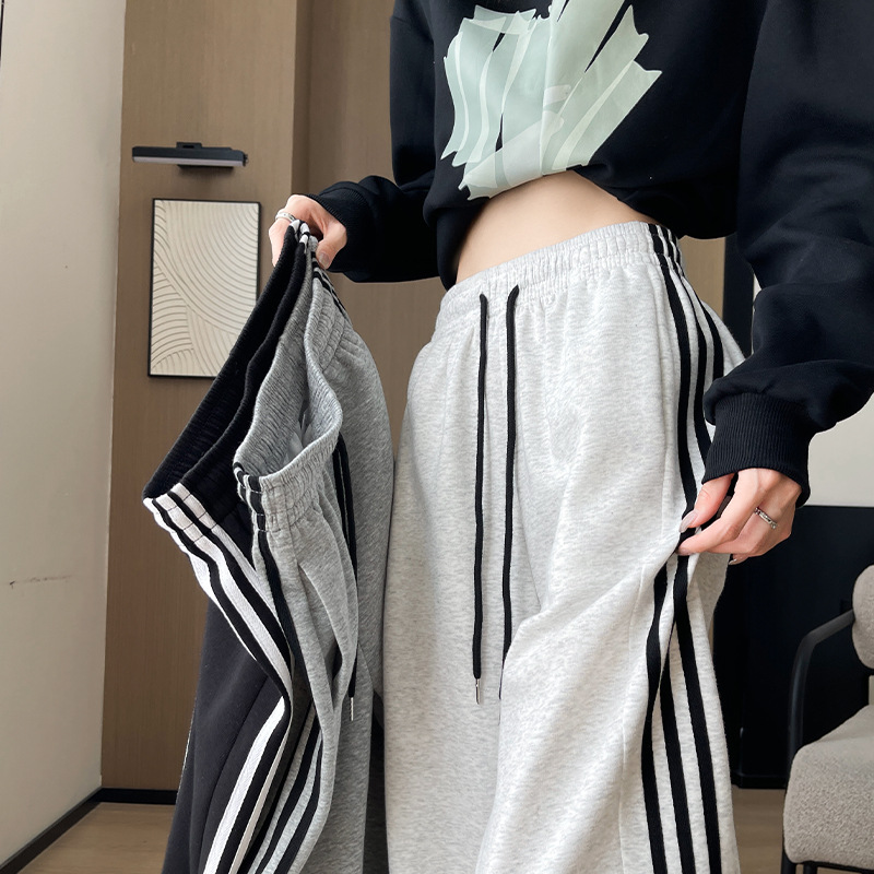 卫裤女春秋2025新款条纹运动加绒加厚阔腿裤小个子宽松休闲直筒裤