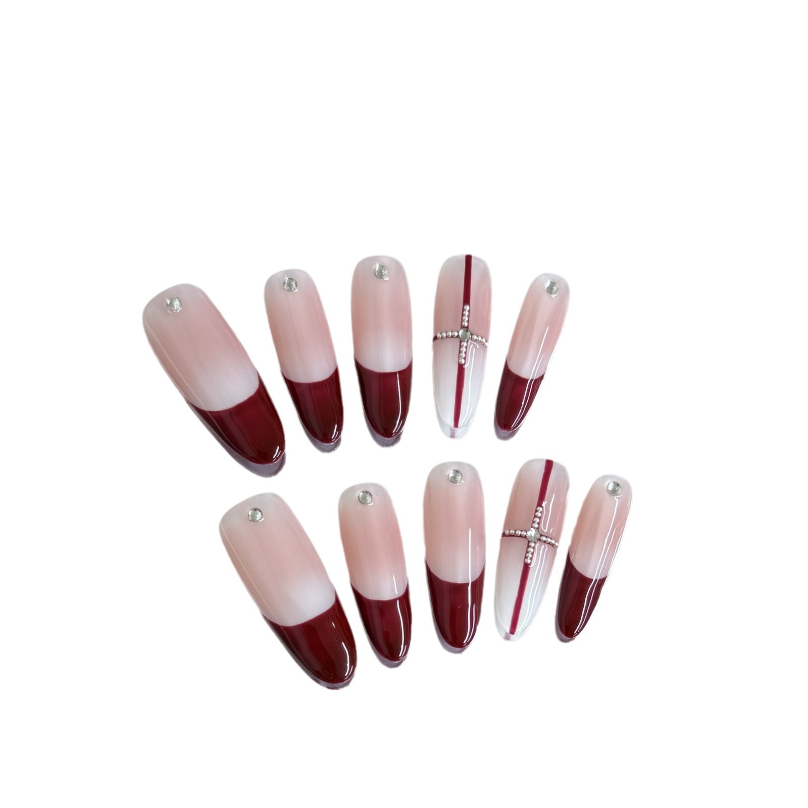 手工穿戴甲冷艳玫瑰纯欲高级感酒红色法式手绘贴钻十字可拆卸美甲