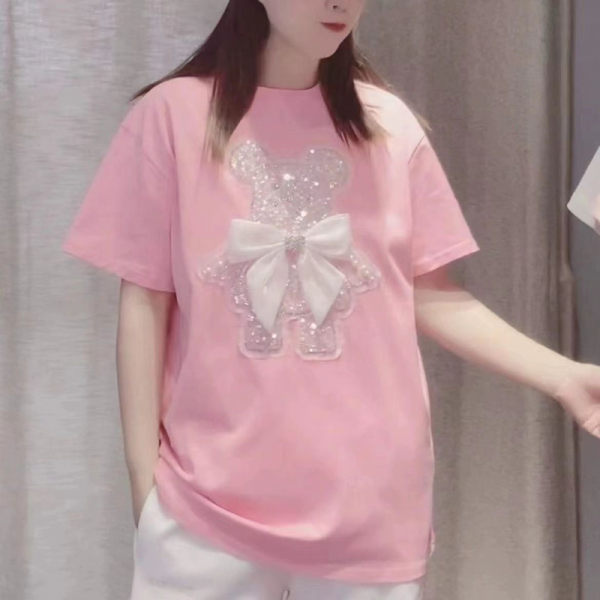 小熊短袖t恤女大码女装设计感小众粉色夏季新款宽松百搭上衣