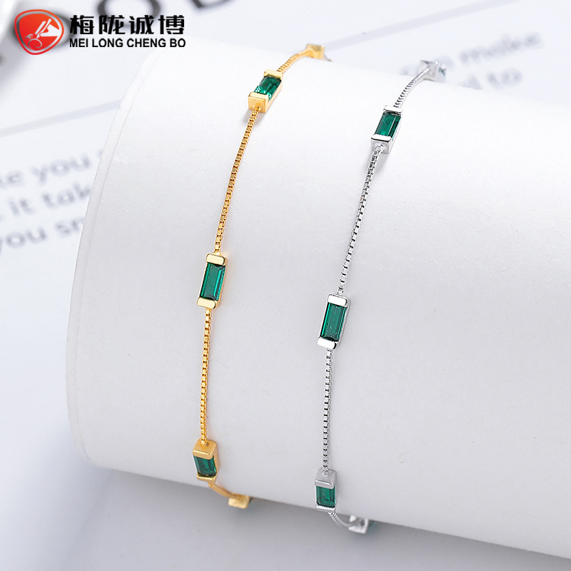 925纯银绿色方钻手链女简约ins方形绿钻盒子链手链时尚气质手饰品