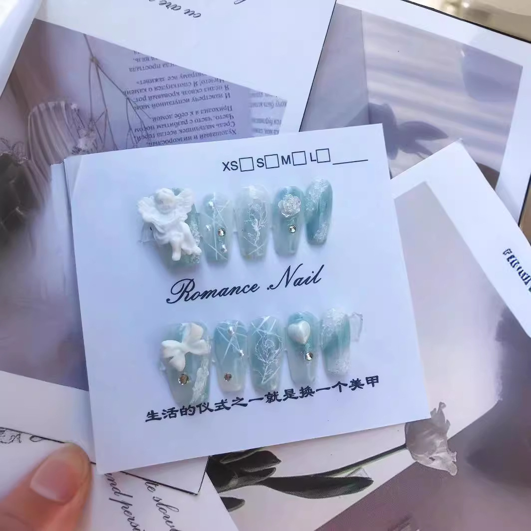 纯手工穿戴甲天使宝宝 ins超仙蓝色款磨砂款高级感光疗假指甲贴片